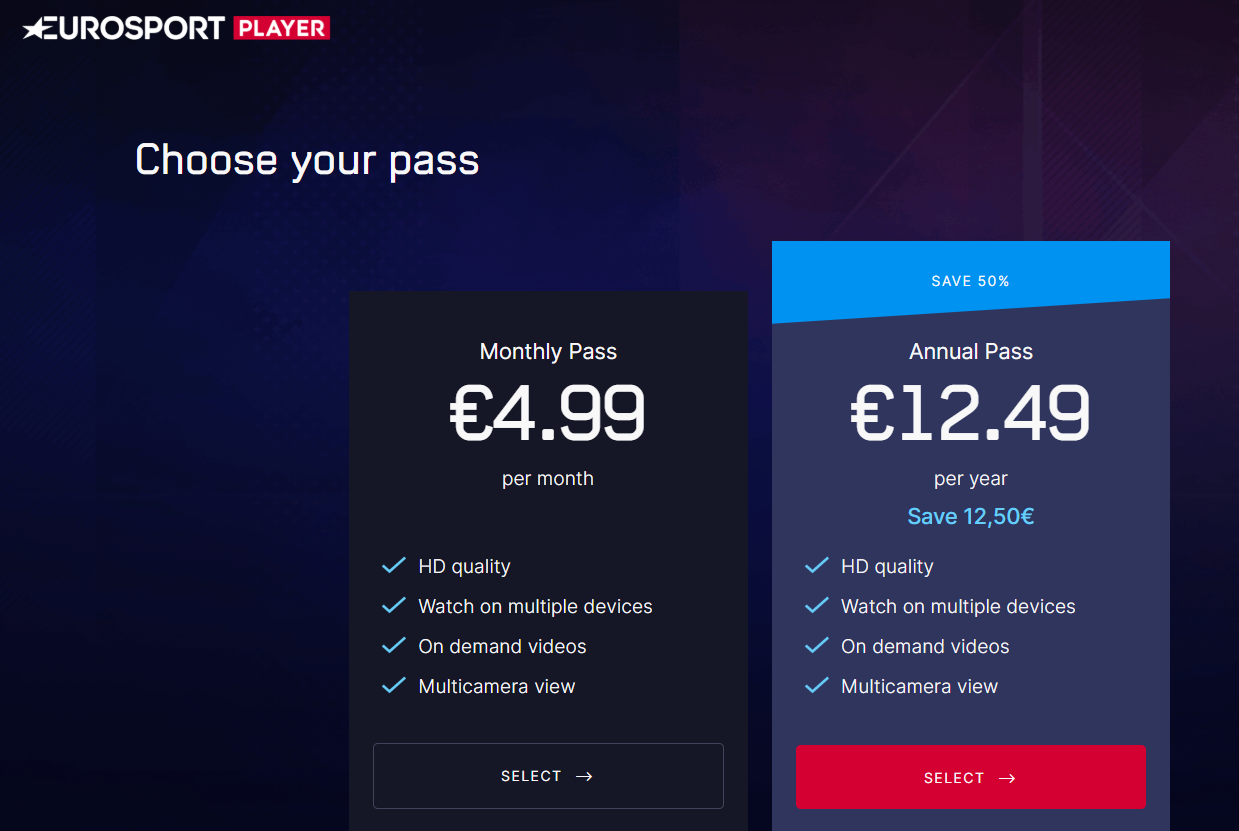 Стандартната такса за годишен абонамент за Eurosport Player е 24,99 евро, докато в момента се предлага за 12,49 евро. Има възможност и за месечен абонамен, който обаче е 4,99 евро на месец.