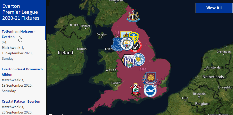 Вижте тук интерактивна карта на всички мачове на Евертън за сезон 2020-21 във Висшата лига.