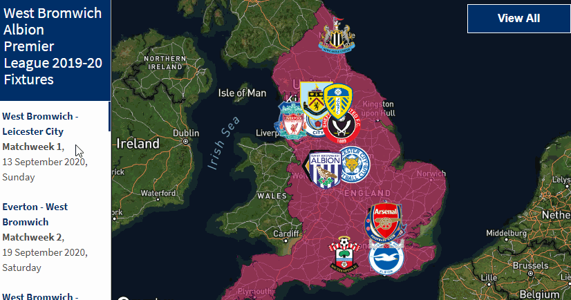 Вижте тук интерактивна карта на всички мачове на Уест Бромич за сезон 2020-21 във Висшата лига.