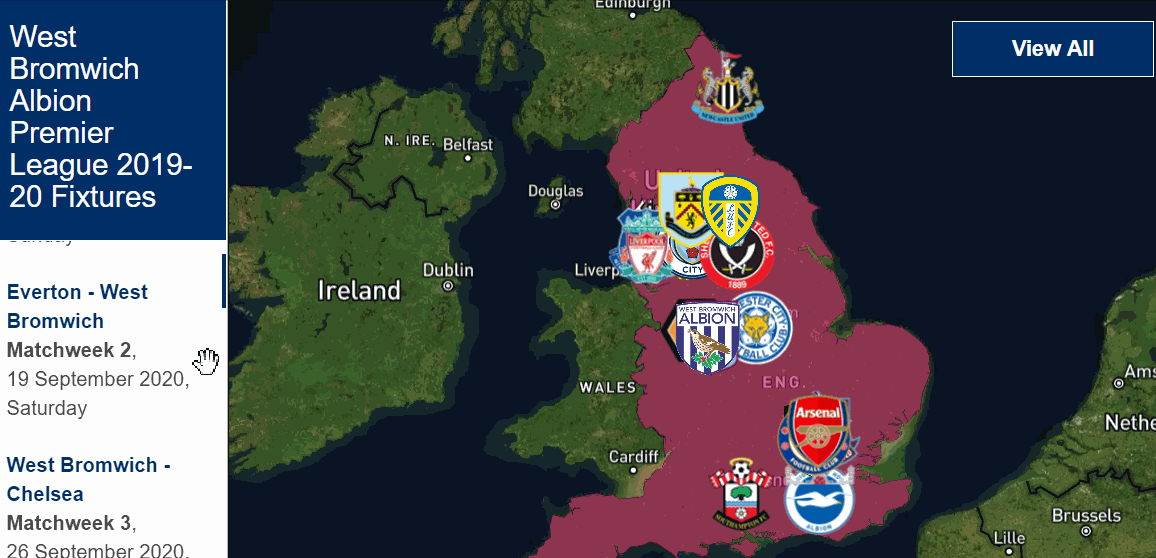 Интерактивна карта на всички мачове на Уест Бромич за сезон 2020-21 във Висшата лига.
