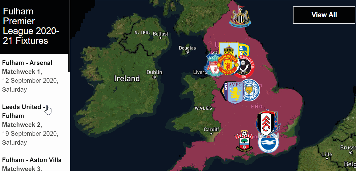 Интерактивна карта на всички мачове на Фулъм за сезон 2020-21 във Висшата лига.