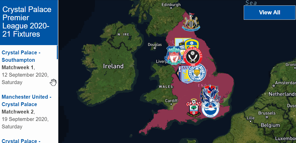 Интерактивна карта на всички мачове на Кристъл Палас за сезон 2020-21 във Висшата лига.